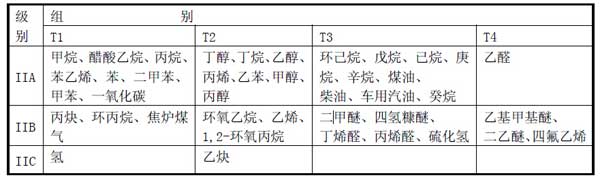 II 類 除煤礦外的其他爆炸性氣體環(huán)境用電氣設備。II 類爆炸性氣體的特性進一步分類為:IIA、IIB、IIC。II 類常見可燃性氣體、蒸氣、溫度組別見下表 II 類 用于除煤礦以外的爆炸性粉塵環(huán)境,III 類再分類:IIIA 類:可燃性飛絮 ; IIIB類:非導電性粉塵;IIIC 類:導電性粉塵;